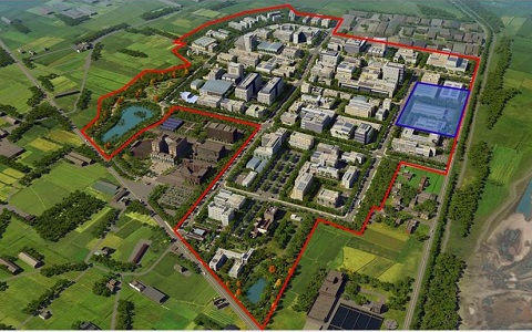 紅色框線為和發(fā)園區(qū)范圍,右上方藍色方塊是鴻海購買土地。(圖片來自臺媒)