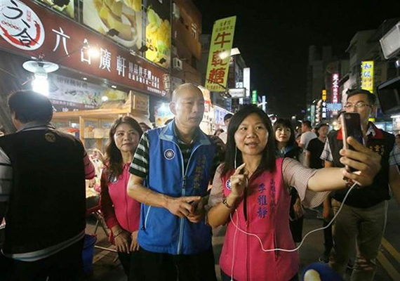 時(shí)任國(guó)民黨高雄市黨補(bǔ)主委的韓國(guó)瑜(中)曾率李雅靜(前排右)、陳玫娟(左二)等10位國(guó)民黨市議員前往六合夜市拜訪攤商,探詢生意情況,李雅靜還以手機(jī)現(xiàn)場(chǎng)直播。(圖片來(lái)源:臺(tái)灣“中時(shí)電子報(bào)”)