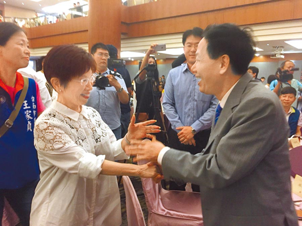 國民黨前主席洪秀柱(前左)到臺南出席林燕祝之友會餐會,受到許多鄉親打氣加油。(圖片來源:臺灣《中國時報》)
