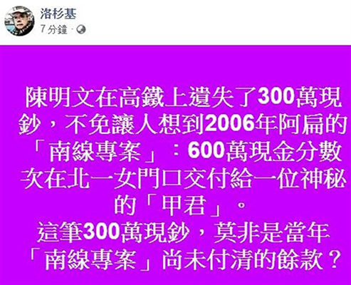 洛杉基表示,陳明文在高鐵上遺失了300萬現(xiàn)鈔,不免讓人想到2006年陳水扁的“南線專案”。他解釋道,2006年600萬現(xiàn)金分?jǐn)?shù)次在臺灣北一女中門口交付給一位神秘的“甲君”,這筆300萬現(xiàn)鈔莫非是當(dāng)年“南線專案”尚未付清的余款?