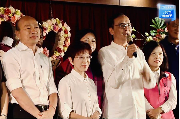 國民黨2020大選提名人韓國瑜今(22日)中午為國民黨前主席、國民黨臺南市第六選區"立委"參選人洪秀柱站臺,與前新北市長朱立倫一起同臺。(圖片來源:臺灣“中時電子報”)