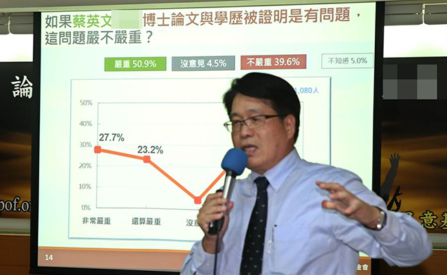 臺灣民意基金會24日舉辦“論文門”全臺民調發表會,董事長游盈隆表示,蔡英文沒有第一時間直接回應博士論文爭議,已大大減少了說服力,拿到博士學位的人都是千辛萬苦,因此相關資料都可以拿出來檢視。(圖片來源:臺灣“中時電子報”)