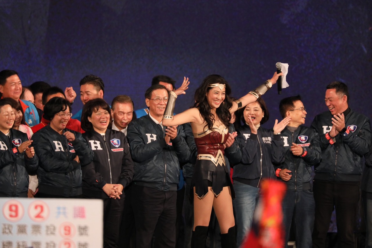 國民黨籍臺(tái)灣地區(qū)民意代表許淑華再度以身著“神力女超人”的衣服為韓國瑜造勢(shì)。 (圖片取自臺(tái)媒)