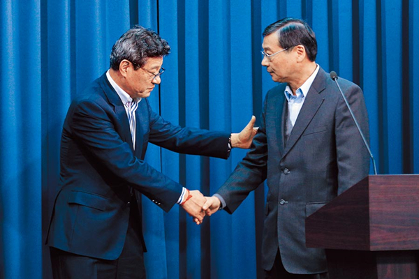 國民黨15日召開選后首次中常會,推舉中常委林榮德(左)代理黨主席,“立院”黨團(tuán)總召曾銘宗(右)暫代秘書長。(圖片來源:臺灣“中時電子報”)