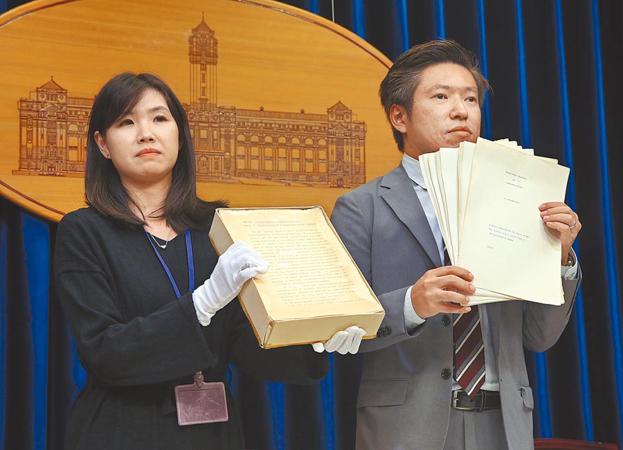 蔡英文辦公室發(fā)言人張惇涵(右)亮出蔡英文在倫敦大學(xué)博士論文原稿。(圖片來源:臺灣“中時電子報”)