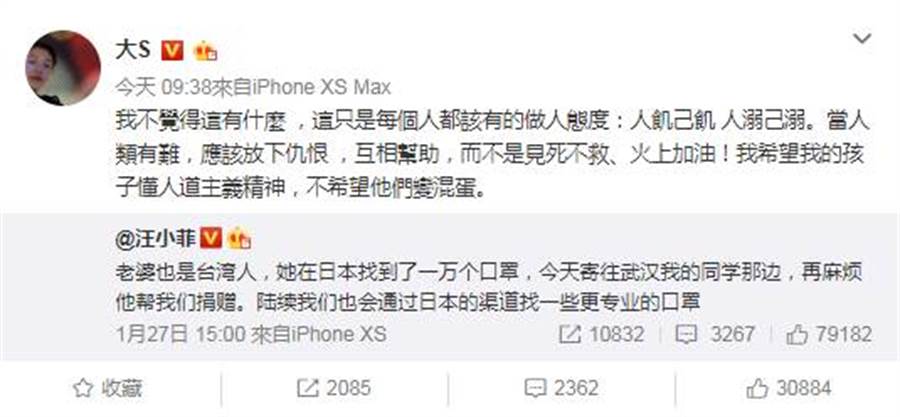 中國臺灣網1月28日訊 汪小菲27日在微博透露,妻子大S在日本狂掃1萬個口罩,并表示會捐到武漢去,小S也力挺姐姐的行為,此舉讓網友非常感動。大S今早也發微博響應“這只是每個人都該有的做人態度。”