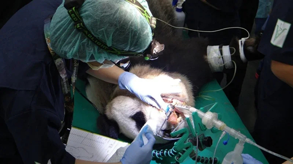 大熊貓繁殖工作小組為團(tuán)團(tuán)圓圓進(jìn)行人工授精。(圖片來源:臺北市動(dòng)物園)