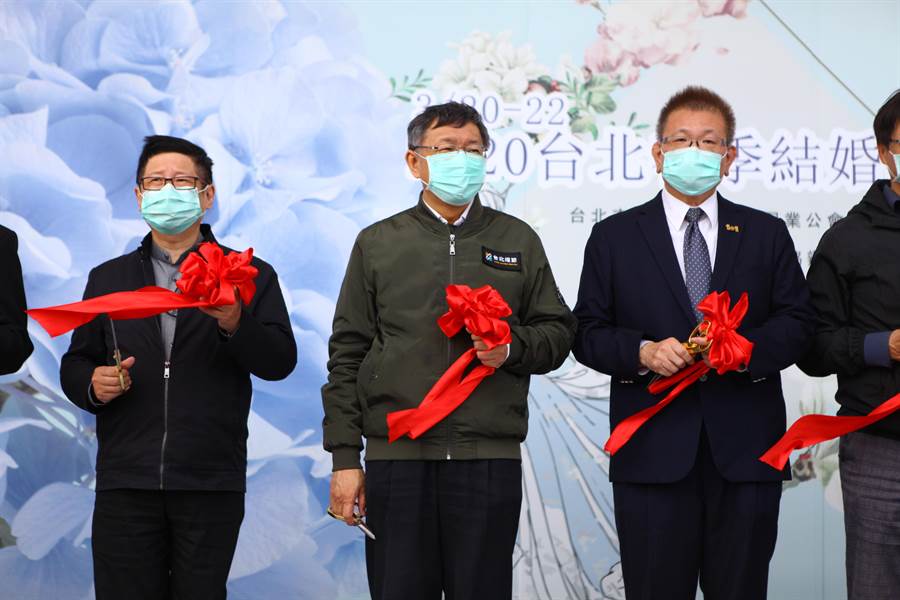 臺(tái)北市長(zhǎng)柯文哲(左二)20日參加結(jié)婚購(gòu)物節(jié)。(圖片來(lái)源:臺(tái)灣“中時(shí)電子報(bào)”)