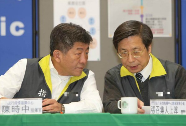 臺灣流行疫情指揮中心指揮官陳時中(左)與專家咨詢小組召集人張上淳(右)。(圖片來源:臺灣“中時電子報”)