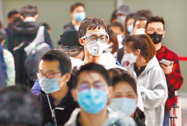 臺灣自24日起禁止所有旅客在臺過境轉機,在桃園機場第二航廈,一群過境的旅客排隊準備安檢。(圖片來源:臺灣“中時電子報”)
