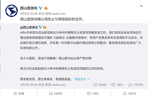 豈料,消息傳出后,引發臺灣地區部分玩家不滿。3日晚間,部分臺灣地區玩家在《劍網3》臺服聊天頻道內發布多條有關疫情不當言論,甚至以污名化的“武漢肺炎”刷屏。對此,西山居游戲第一時間在官方微博發布聲明,勒令臺服代理運營商立即整改。在遭到臺服代理運營商的拖延和拒絕后,西山居游戲隨后又補發聲明“確認將終止與網銀國際的合作”。