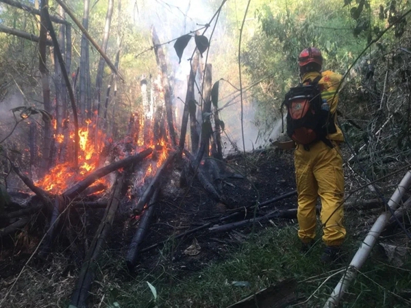 高雄市六龜新威山區昨起發生林地山火,竹林燃燒后火勢猛烈。(圖片取自臺媒)