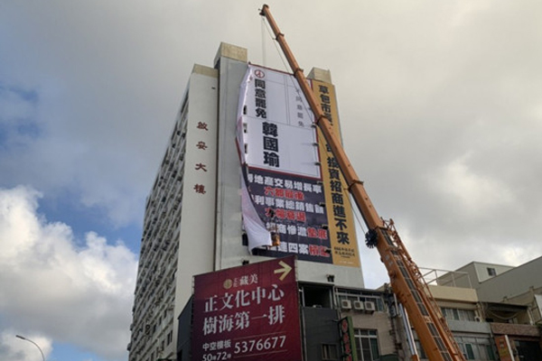 中國臺灣網5月3日訊 據臺灣“聯合新聞網”報道,“罷韓”團體5月1日吊掛15層樓高的“罷韓”帆布廣告牌,高雄市環保局5月3日清晨以“手續不齊全”為由予以拆除。而“罷韓”團體則批評高雄市府選擇性執法太粗暴,將啟動所謂的“人形廣告牌計劃”。
