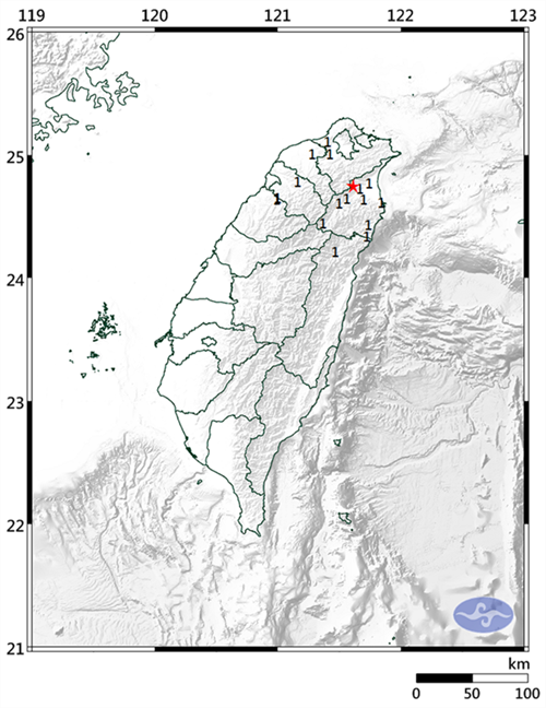 各地震度級:宜蘭縣、新北市、桃園市、新竹縣、花蓮縣、苗栗縣1級。(中國臺灣網(wǎng) 李寧)