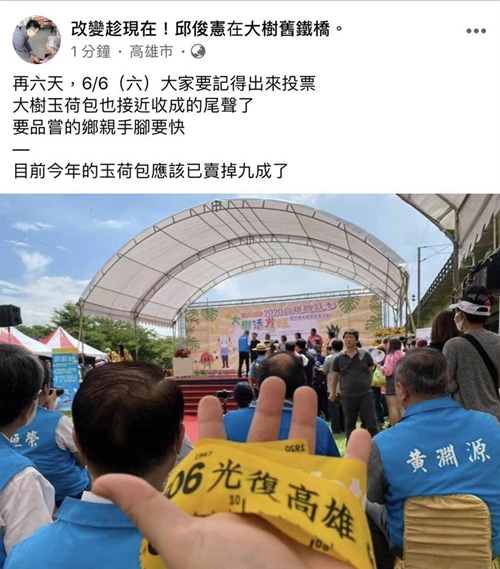 2020高雄鳳荔季開幕典禮30日上午舉行,韓國(guó)瑜與多位局處首長(zhǎng)、議員均出席這場(chǎng)盛事,民進(jìn)黨議員邱俊憲也參加了這場(chǎng)活動(dòng)。儀式進(jìn)行到請(qǐng)?jiān)趫?chǎng)來賓上臺(tái)時(shí),包括司儀、高雄市新聞局長(zhǎng)鄭照新皆上前邀請(qǐng)邱俊憲一同上臺(tái),但他當(dāng)場(chǎng)婉拒,仍然坐在臺(tái)下貴賓區(qū)。不料,沒多久邱俊憲就在臉譜網(wǎng)發(fā)文,寫著“再六天,6/6(六)大家要記得出來投票”,并附上一張?jiān)谂_(tái)下手拿“光復(fù)高雄”黃絲帶、臺(tái)上韓國(guó)瑜正在頒獎(jiǎng)的照片。