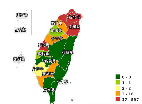 根據臺“疾管署”“全臺本地病例地理分布圖”顯示,從去年1月至今,島內累計1329例本地個案,其中以新北市597人最多,接著依序是臺北市526人、桃園市82人、彰化縣58人、宜蘭縣21人、基隆市17人,以上這6個縣市皆是紅色警戒燈號。