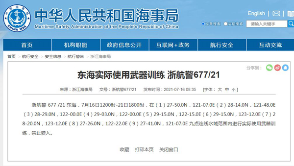 中國臺(tái)灣網(wǎng)7月17日訊 據(jù)中國海事局網(wǎng)站消息,浙江海事局16日發(fā)布航行警告,7月16日12時(shí)至21日18時(shí),東海部分海域?qū)⑦M(jìn)行實(shí)際使用武器訓(xùn)練,禁止駛?cè)搿4耸乱l(fā)臺(tái)媒關(guān)注,稱此次軍演范圍距離臺(tái)灣本島最近距離僅約243公里。