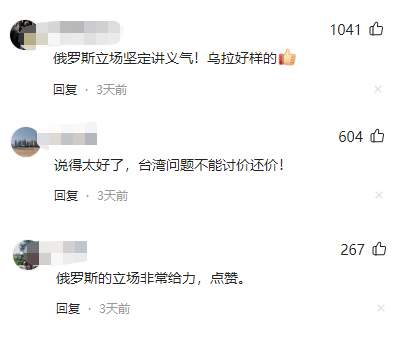 俄羅斯在涉及核心利益問題上對中方表達的堅定支持,在社交媒體上引發熱議。有網友在中國臺灣網官方社交賬號上留言指出,“俄羅斯立場堅定講義氣!烏拉好樣的!薄罢f得太好了,臺灣問題不能討價還價!”“俄羅斯的立場非常給力,點贊!薄案兄x俄羅斯朋友對中國統一大業的支持!”“俄羅斯敢做敢為,為正義發聲點贊!薄案矣谥С种袊塘x執言,點贊了!”“中俄攜手,共筑和平!”