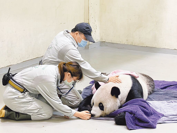 大熊貓“團(tuán)團(tuán)”19日下午1時(shí)48分心跳停止,赴臺(tái)14年歲月正式落幕。圖為工作人員陪伴“團(tuán)團(tuán)”。(圖片來(lái)源:臺(tái)北市動(dòng)物園)