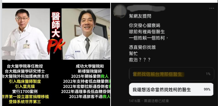 還有島內(nèi)網(wǎng)友發(fā)起了網(wǎng)絡(luò)投票:“幫網(wǎng)友提問,你突發(fā)心臟衰竭,眼前有兩個醫(yī)生,一個姓柯、一個姓賴,憑直覺,你會找誰幫忙救治?”結(jié)果共投出1416票,僅有1%的網(wǎng)友選擇“當(dāng)然找信賴臺灣那個醫(yī)生”,而99%的網(wǎng)友則投給“我還想活命,當(dāng)然找姓柯的醫(yī)生!”