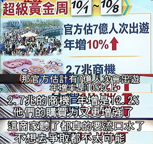 今年,大陸約會有7億人次會出游且大概會創造出2.7兆(臺灣方面所使用的“兆”為1萬億新臺幣)的十一“超級黃金周”,臺媒羨慕的表示,如此商機真是令不少臺灣觀光業的商家都垂涎。