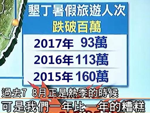 以墾丁為例,其原本是“暑期游”的大熱之地,可是近兩年的情況一年比一年糟糕,今年的暑期旅游人次更是跌破了百萬大關。