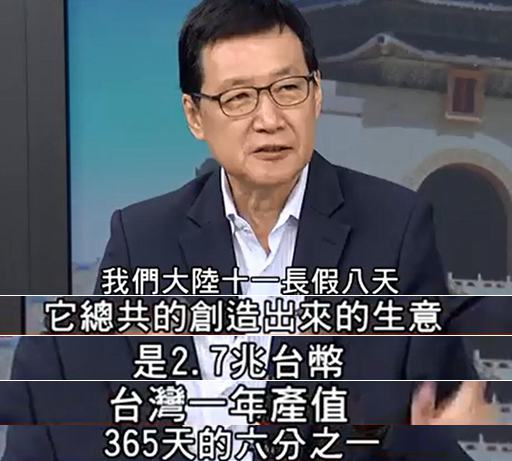 國民黨“立委”費鴻泰就說了,大陸一個“黃金周”就能創造出2.7兆的產值,這可是臺灣一年16兆產值的六分之一啊