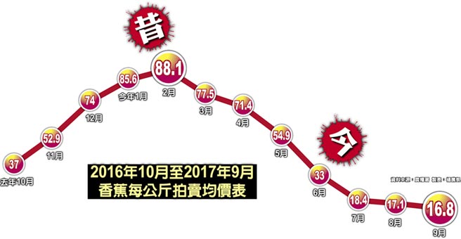 2016年10月至2017年9月臺灣香蕉每公斤拍賣均價表(單位:新臺幣;圖片來源:臺灣《聯(lián)合報》)