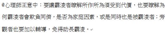 臺灣某初中的前校長稱:“學校老師發現霸凌事件,是否要跟家長說,必須看情況,家長有時是助力,也可能是阻力。家長本身可能就是問題制造者,以此情況,老師并不適合立刻跟家長溝通,但如果家長很明理,就可以敞開來談。”