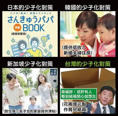 其實,“少子化”不是臺灣才有的問題,日本、韓國、新加坡等地都受此困擾,而相比其他地方更實用之施不同的是,蔡英文當局鼓勵生育的措施竟是推出個“育兒百寶箱”……