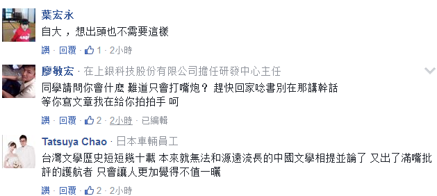 有網友表示:“好了乖孩子,別在這兒秀下限了!你有言論自由我不否認,但肚里沒什么墨水,卻要硬擠出腐水,那就不好了。建議你先去學好歷史,了解何謂歷史,了解何謂歷史脈絡,看你的言論就能知道臺灣壓根不重視歷史教育!對了,你也不懂文學。”