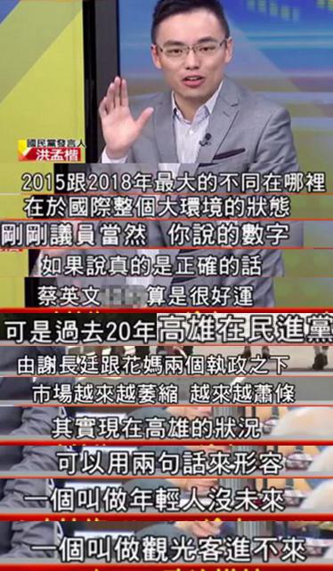 國民黨發言人洪孟楷先發制人的表示,如果議員給出的數字是正確的話,那只能說“蔡英文算是很好運”,而事實是,高雄在民進黨近20年的執政下,現況用兩句話就能形容:1)年輕人沒未來;2)觀光客進不來。