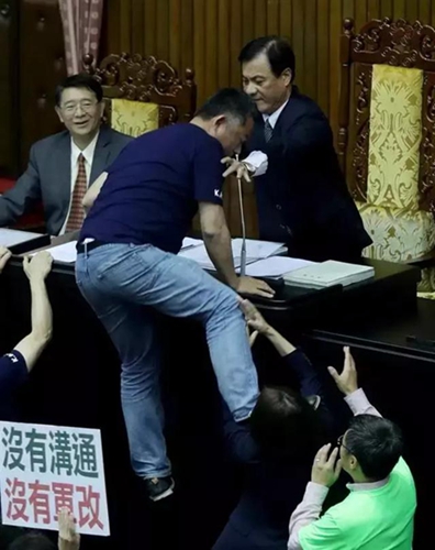 過程中,國民黨“立委”許毓仁一度被民進黨“立委”鐘佳濱推倒,因撞到頭被送往臺大醫院急診。不僅如此,就連“立法院長”蘇嘉全也罕見卷入戰局,出手把準備爬上主席臺的“藍委”楊鎮浯推落,引發外界質疑“‘議長’中立已死”“蘇嘉全此舉,就是要為民進黨保駕護航”。