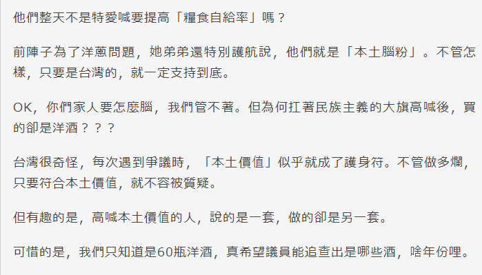 再來說送禮的內容,洋酒。以往蔡英文曾被爆料愛吃法國大餐,這回吳音寧送禮送洋酒算是對上了。只不過你吳音寧口口聲聲說要支持本土農產品,霸占道德高地,到頭來卻做起了洋酒“生意”,不覺得臉疼嗎?下面這位臺灣網友說出了大部分人心里的感受:
