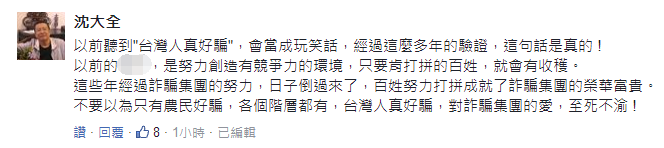 而在心疼之余,也有人認為,這些選民是“自作自受”,賴清德的臺南市長,蔡英文的臺灣地區領導人,不都是源自他們對“詐騙集團”至死不渝的愛么……