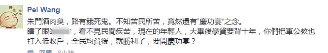 詩人渡也則發文稱,公敎人員大多是溫良恭儉讓者,而蔡英文、賴神絕對不是!兩個違規搶人民財產者卻大言不慚地表示“我們沒慶祝,很客氣了,不然要怎樣”,難道他們兩位希望退休軍公敎人員向他們致謝道歉嗎?直言這是“得了便宜還賣乖!什么叫欺人太甚?這就是了”