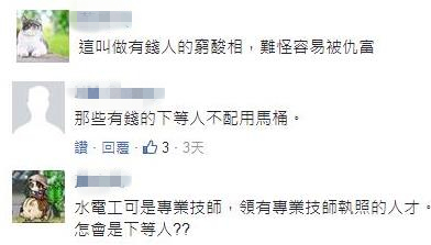 網(wǎng)友多數(shù)一面倒的力挺原PO,“這叫做有錢人的窮酸相,難怪容易被仇富”“真的很厲害的人才不會看不起別人”“水電工可是專業(yè)技師,領(lǐng)有專業(yè)技師執(zhí)照的人才,怎會是下等人?”“每個行業(yè)都是一個螺絲釘,沒有這些螺絲釘,我相信他們連住的地方都沒有”“那些有錢的下等人不配用馬桶”。