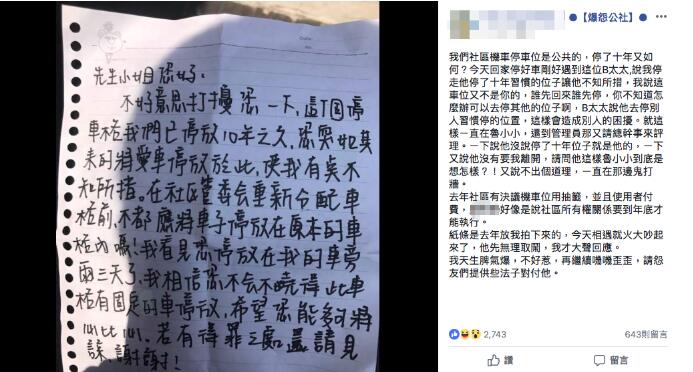 此外,她還在“爆怨公社”PO出了張去年該鄰居留下的紙條,留言中“停放十年的車格被停走,不知所措”的論調(diào)與當(dāng)天發(fā)生的狀況如出一轍。