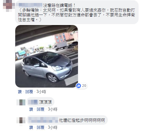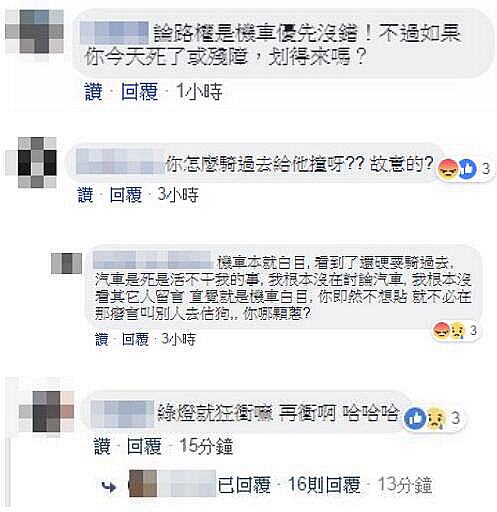 但萬萬沒想到有部分網(wǎng)友看完后竟反酸吳男,“綠燈就狂沖嘛,再?zèng)_啊,哈哈哈”、“你怎么騎過去給他撞呀?故意的?”、“明知道車子想過,還硬要直行過,覺得自己路權(quán)大自己就對,活該”、“下次遇到砂石車也一樣要用生命捍衛(wèi)路權(quán)哦”。