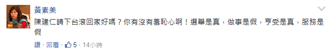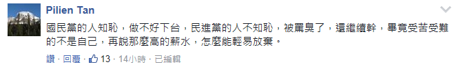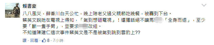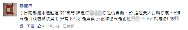而以民進(jìn)黨一貫的作風(fēng),在出了事之后,也絕不會(huì)這么輕易認(rèn)輸投降。果不其然,就在昨天,陳建仁于臉譜網(wǎng)貼文致歉,還提到自己沒有防災(zāi)職權(quán),以求避免跟當(dāng)年薛香川同樣的下場(chǎng)。可惜的是,網(wǎng)友對(duì)此并不買賬,甚至紛紛吐槽“這種行徑很惡劣你知道嗎?”“以前罵別人罵得很過癮,現(xiàn)在是現(xiàn)世報(bào)!”