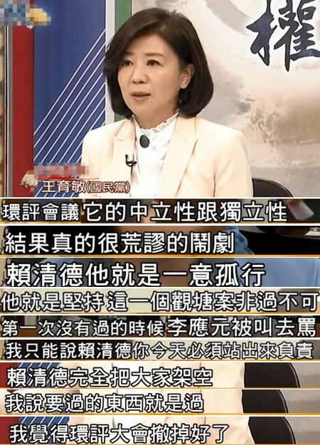 “藍委”陳宜民也質疑,如果官派代表敢“強硬闖關”,那以后也不需要做什么環評,只要“行政院”想做的案子,沒有人擋的了他(賴清德);王育敏更直言,賴清德就是一意孤行,他說要過的案子就一定得過,“環評大會撤掉好了”。