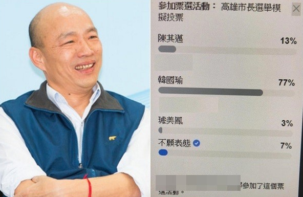 這個名叫“爆料公社”的臉譜網帳號,7日晚間在網絡上舉行模擬投票活動。結果出爐后,高雄的模擬選情成為大家關注的焦點,“賣菜郎”國民黨高雄市長參選人韓國瑜竟以77%得票率大勝陳其邁13%。