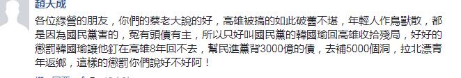 有人則“認(rèn)同”地提議,既然蔡英文說高雄今天的落魄是被國(guó)民黨所害,那“冤有頭債有主,就讓國(guó)民黨的韓國(guó)瑜回高雄收拾殘局吧,這懲罰多好”;