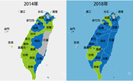 去年剛剛結束的“九合一”選舉,國民黨讓藍天重回15個縣市,一片大勝之勢(下圖,看顏色就好)。不過也有些島內媒體人和國民黨人士示警:這次選舉是民進黨選輸了,而非國民黨選贏了。實在是民進黨當局政策背離民意太遠,才導致了如此慘敗。
