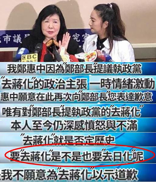 中心思想就是:自己打人這個(gè)“行為”不對,向鄭麗君致歉,但“動(dòng)機(jī)”沒毛病,而且特意強(qiáng)調(diào)不會(huì)為“去蔣化”道歉,并直言“要‘去蔣化’是不是也要‘去日化’?”她認(rèn)為“去蔣”不是臺(tái)灣人民共識(shí),鄭麗君身為“文化部長”卻未傾聽人民意見,推動(dòng)“去蔣化”是撕裂臺(tái)灣人民情感。