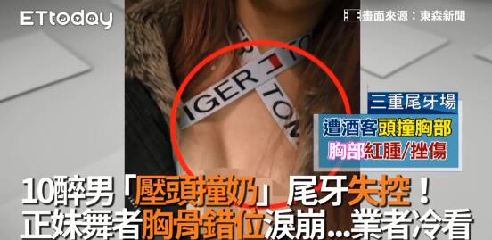 一名戴姓女舞者日前爆料稱,自己透過營銷公司接了新北市某水果行的尾牙活動,不想竟被10多名醉漢壓制,還遭一男子用頭不斷撞擊胸部,導致其胸骨錯位;更過分的是,期間業者一直在旁冷眼旁觀!