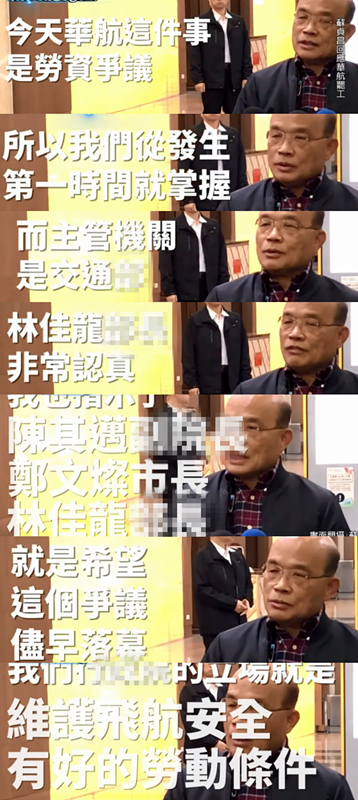 吳子嘉所說的“罷工”,指的是這幾天島內(nèi)最具熱度的“華航罷工”事件,在人流高峰期,華航機(jī)師就集體罷工,對消費(fèi)者和整個交通系統(tǒng)造成了極大沖擊。對于安檢這種小事都要親自來管的蘇貞昌,面對這樣的大事,豈不更要賣力氣?不,蘇貞昌不但沒有加戲,還把自己的戲份全部刪掉了。