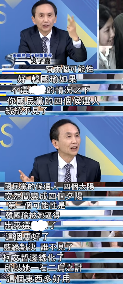 資深媒體人吳子嘉進行了一番深入解讀。蔡英文打韓國瑜原來是個一石二鳥之計。如果韓國瑜不選2020,那么蔡英文打韓則會將國民黨“太陽們”“掃進垃圾桶”;如果韓國瑜參選,則選舉將回歸“藍綠對決”,主打白色力量的柯文哲就會被邊緣化。