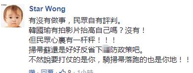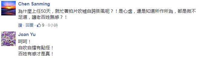 也有網(wǎng)友認為,蘇貞昌根本就是“心虛”或者他很清楚自己所做的事都讓老百姓無感,而只有“無能的人才會細說自己做了什么”,因為“會做事的人不用自己細說,人民都在看”;還有人拿如今風頭正勁的韓國瑜類比,直言“韓國瑜有拿影片抬高自己嗎?沒有!但民眾心中有一桿稱”。