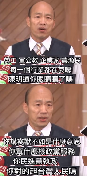 韓國瑜表示,勞工、軍公教、企業家、農漁民,每一個行業都在哀號,“陳明通你瞎了嗎?講禽獸不如是什么意思?”“我們在拼經濟,你講這么惡毒的話是什么意思?陳明通你的書是讀到狗的肚子里面了嗎?你把你的知識拿來維護你的官位,昧著良心講話嗎?用禽獸兩字形容有必要嗎?”